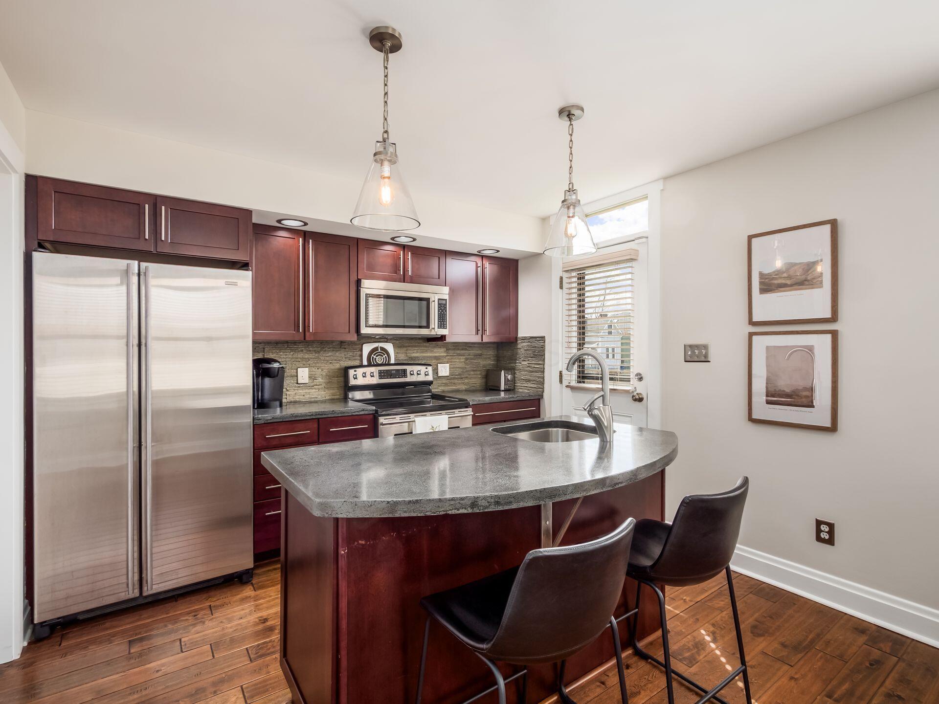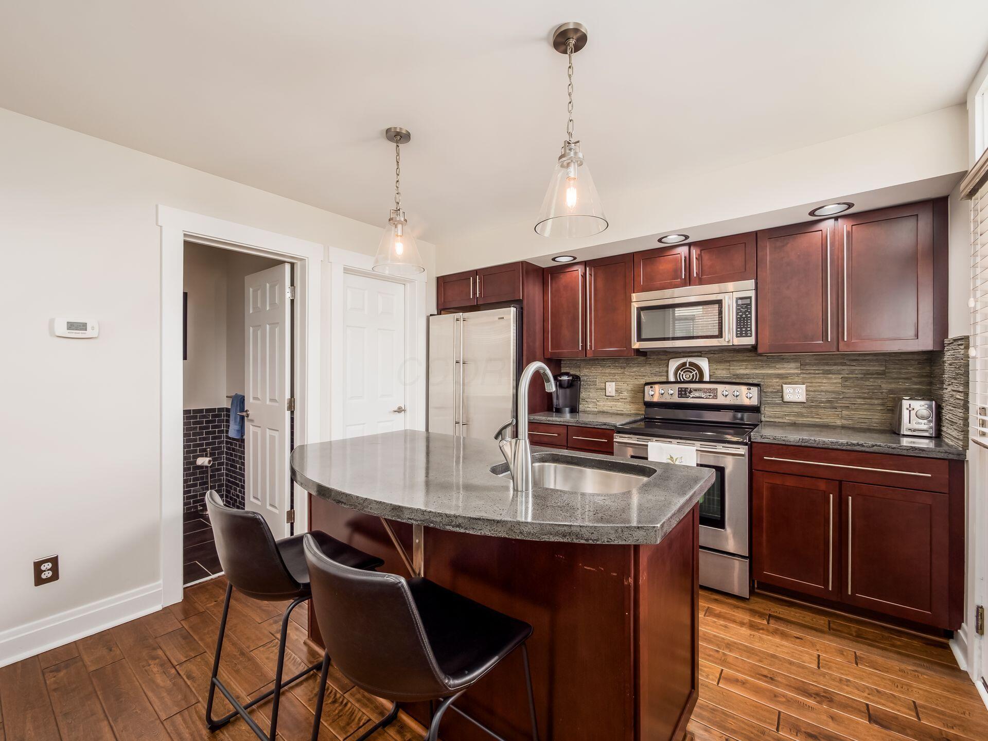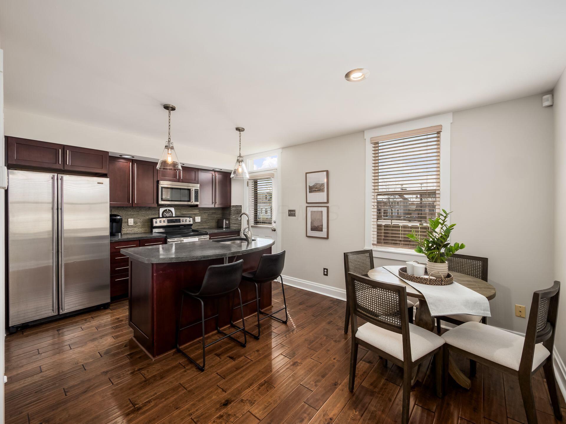 Freestanding condos in German Village are rare--especially those with private outdoor space and off-street parking. This one offers the privacy of a single-family home with low-maintenance living in a prime location. Hardwood floors and a fireplace with built-ins anchor the main living space, while the updated kitchen features stainless steel appliances, rich cabinetry, and island seating. The layout includes first-floor laundry, a half bath, and two spacious bedrooms upstairs with access to full baths, including a bright primary suite. Enjoy a private fenced paver patio and the rare convenience of two off-street parking spaces. Low HOA of $200.50/month and rental-friendly policy (30-day minimum) provide flexibility for owners or investors. Surrounded by neighborhood favorites--just moments from Fox in the Snow, South Village Grille, and German Village staples.
