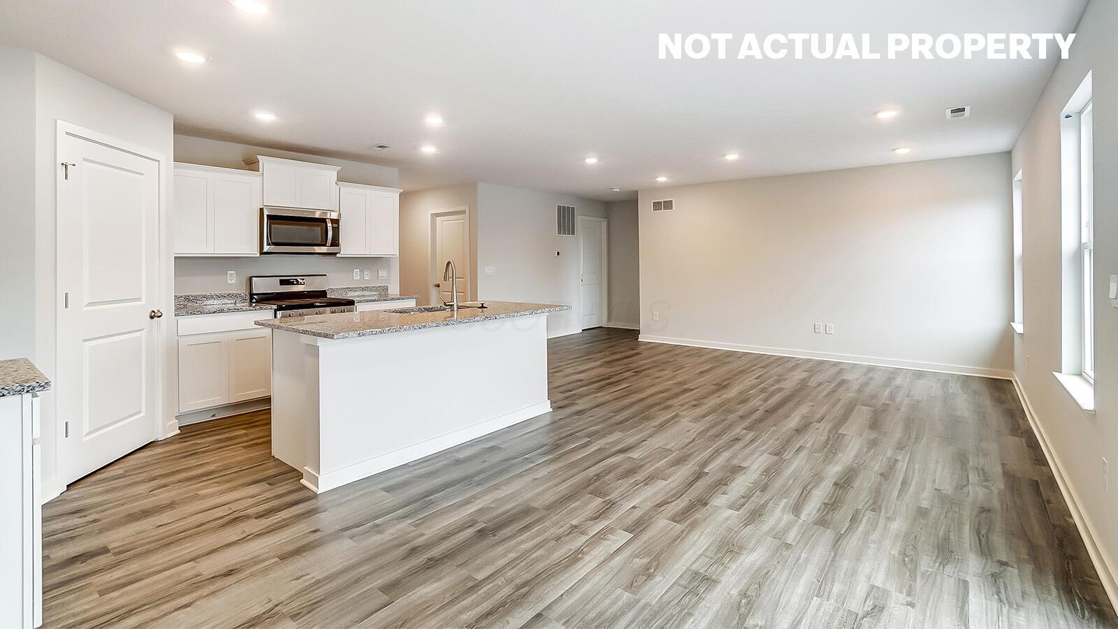 The open floor plan creates a natural flow between the great room, dining space, and chef-inspired kitchen--complete with a large center island, walk-in pantry, abundant counter space, and stainless steel appliances.
