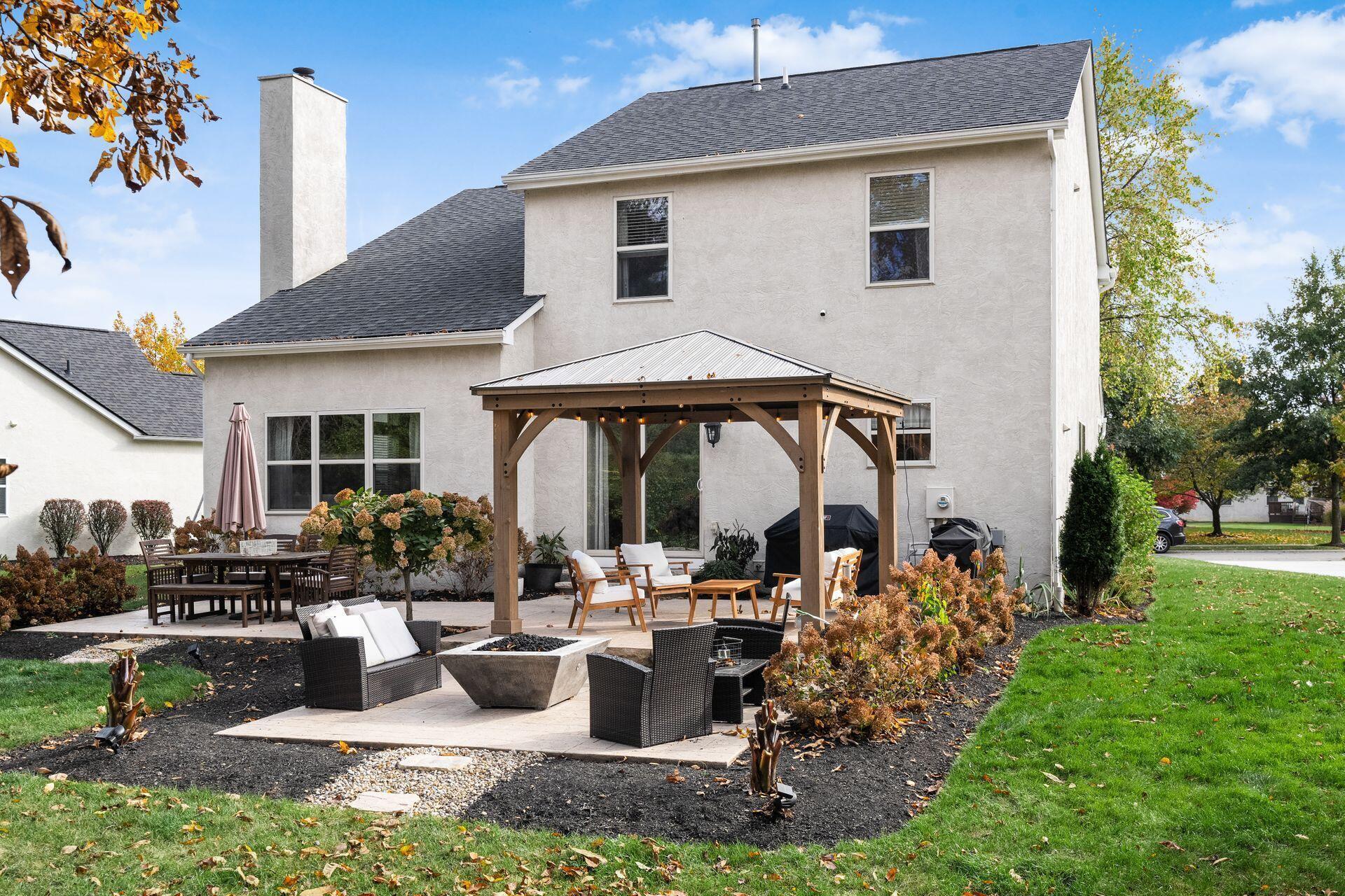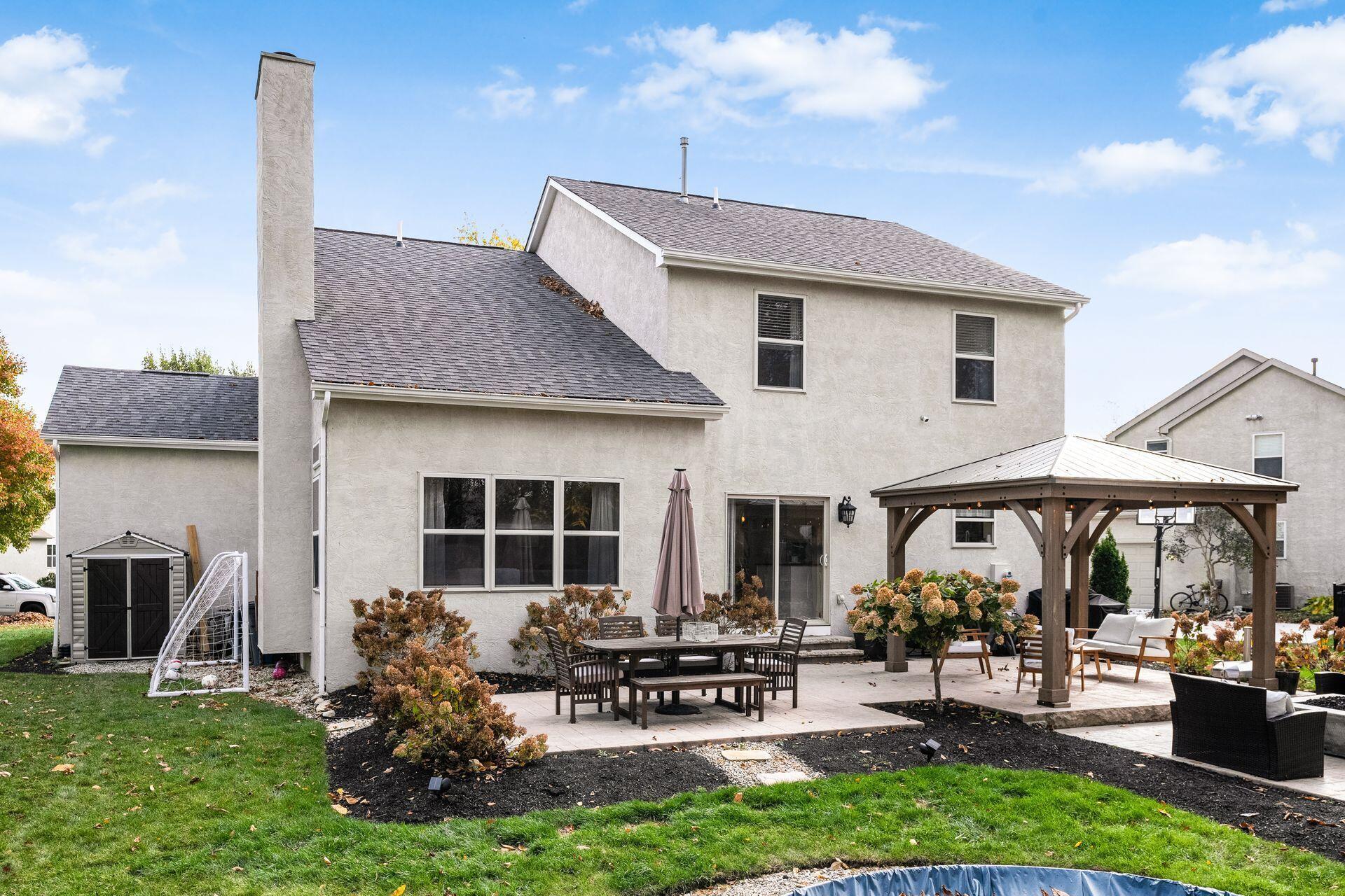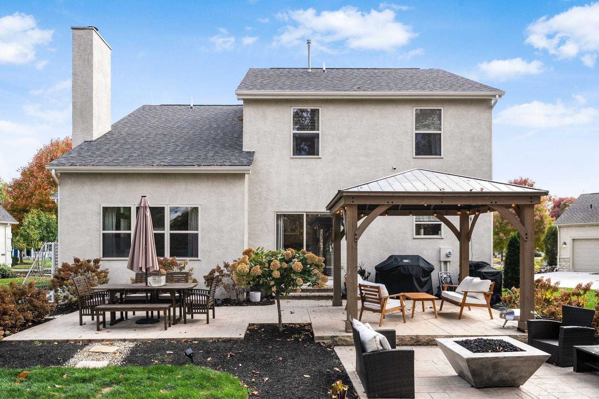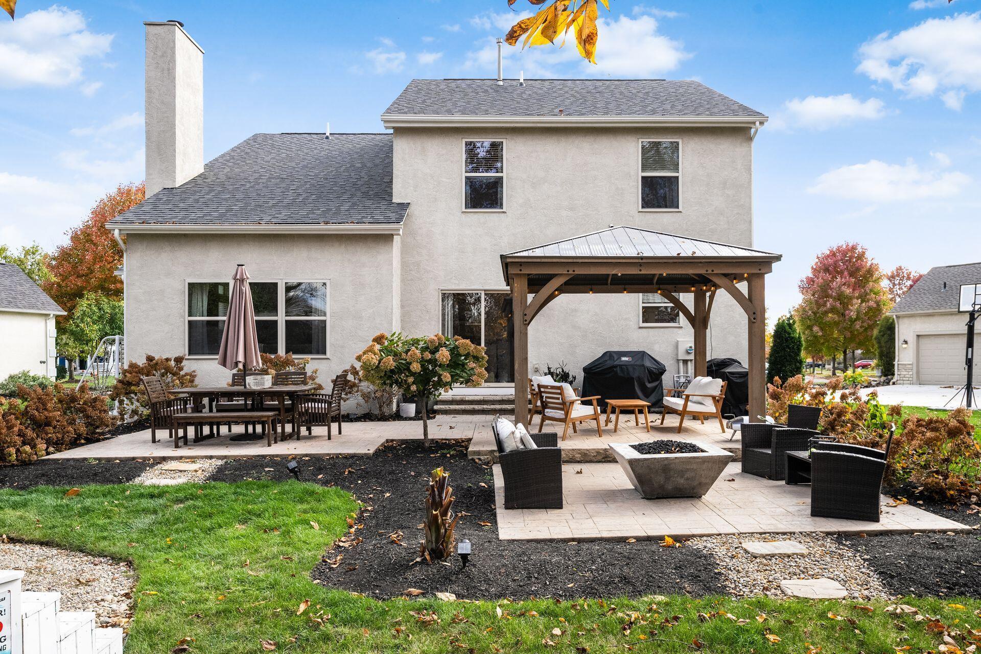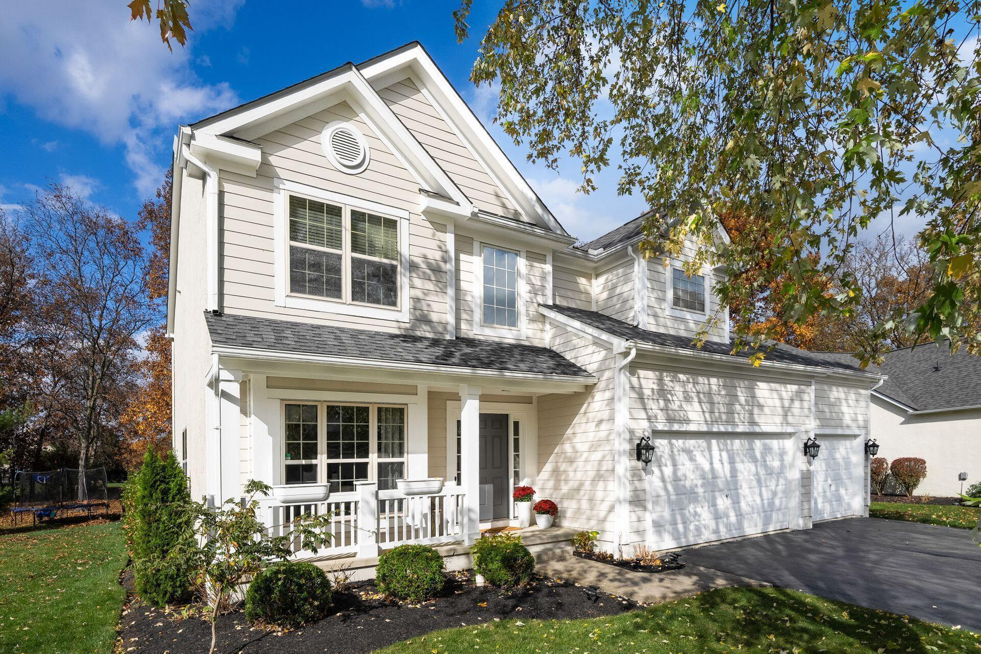 This stunning home, located in the desirable Cramers Crossing subdivision, offers an open floor plan with a beautiful kitchen, dining room, large great room, first-floor den, 4 bedrooms, 2 1/2 bathrooms, first floor laundry, and a great 3-car garage. Updated throughout including a remodeled kitchen and stainless appliances, a beautiful stone gas fireplace, brand new flooring on the main level, new upstairs carpeting, bathroom vanities, finished basement, new roof, new furnace and AC, stamped concrete patio, gas fire pit, pergola, stock tank kids pool with filtration, water softener and RO system, new exterior paint and trim, interior paint, finished garage, and more. Enjoy the private backyard that backs to a 2 acre greenspace. Close to Dublin South Pool and Fountain/Splash Park.