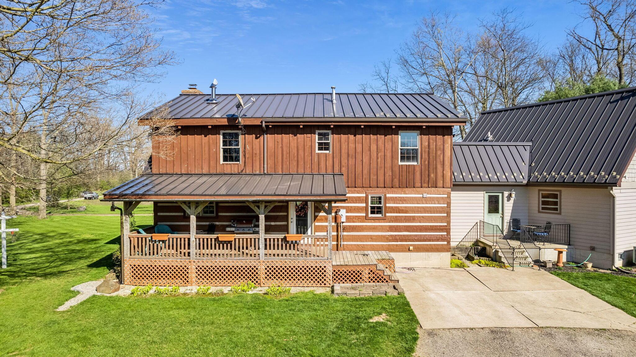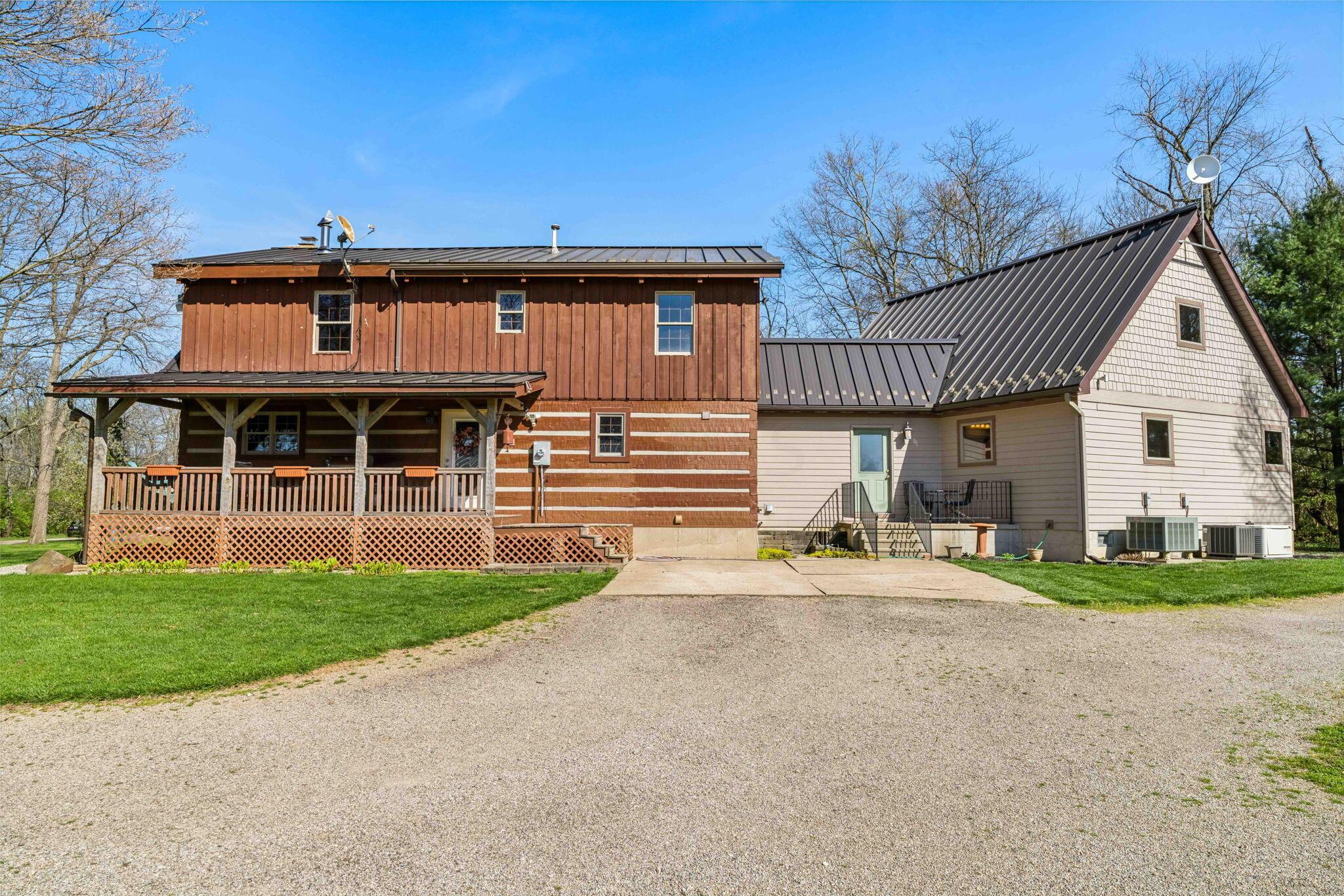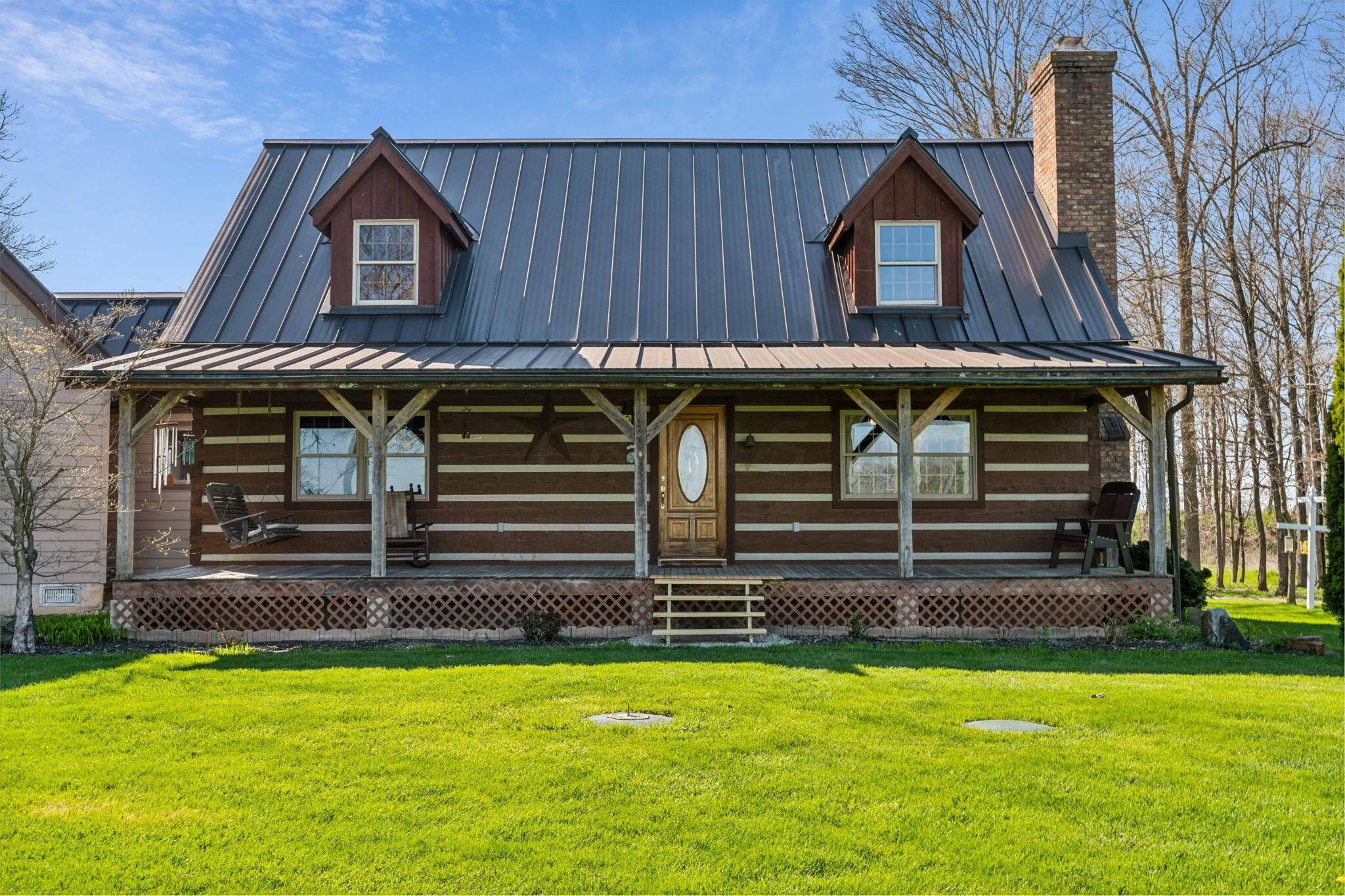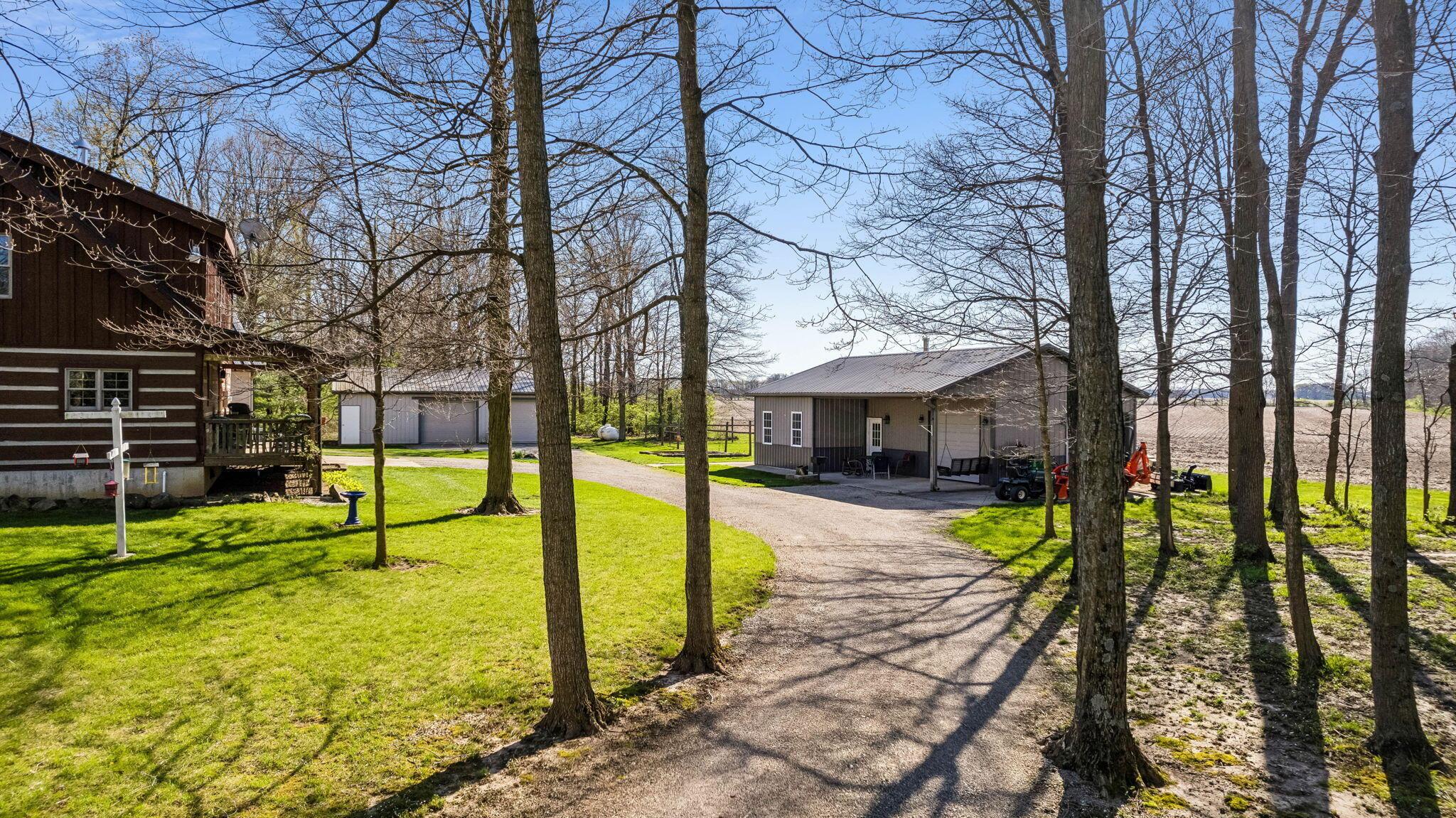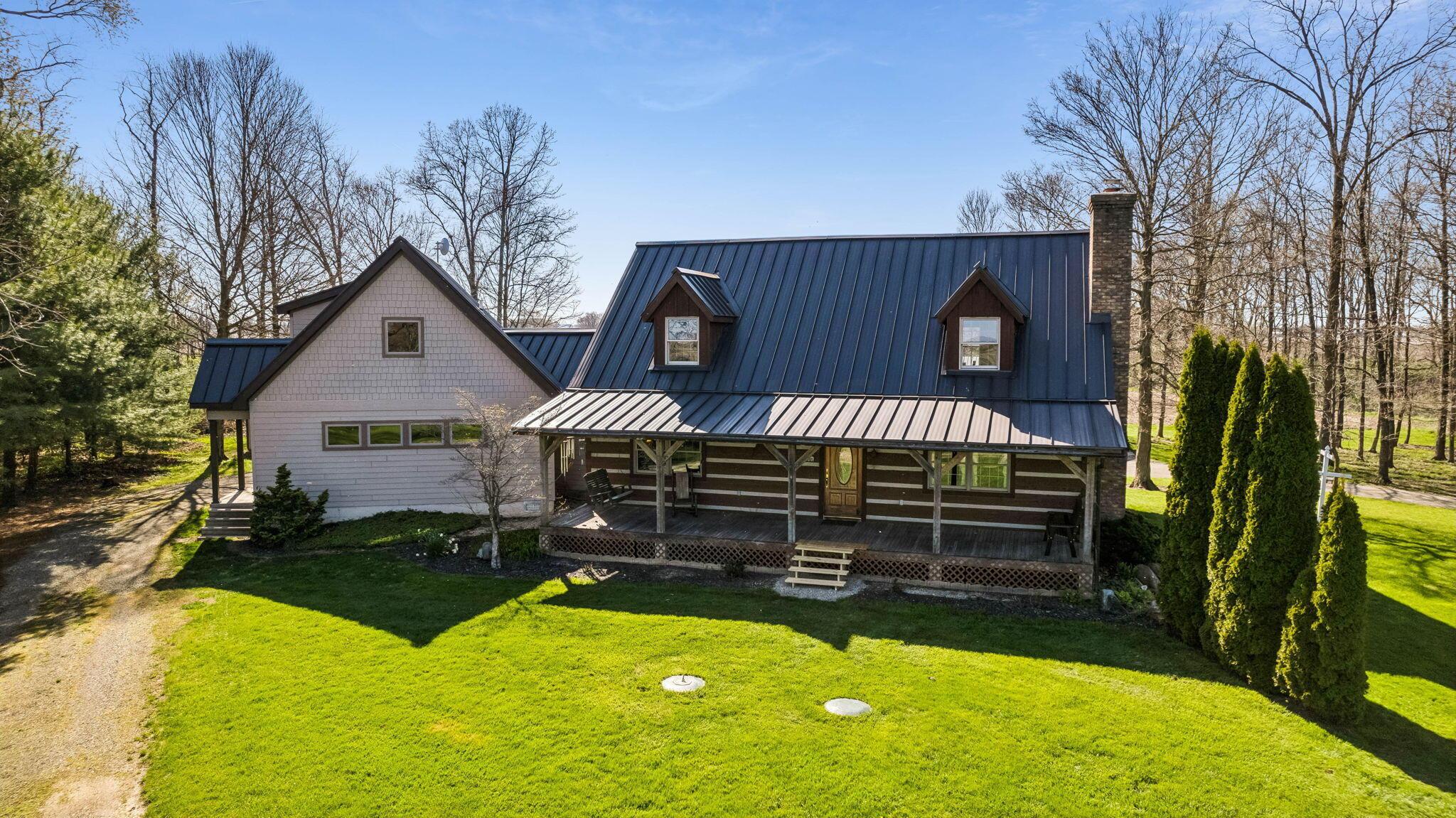 Experience rustic elegance on over 13 acres with this unique log cabin, a true nature lover's dream. The cabin features a 1st floor primary bedroom with en-suite bath and walk-in closet, ensuring comfort. A cozy living area with a wood-burning fireplace sets the tone for relaxing evenings. For guests or family, the property offers a separate guest suite with 2 baths and a full kitchen. Full basement provides ample storage or potential for added living space. Outdoor enthusiasts will love the land and 2 outbuildings; one heated with electric and a kitchen, perfect for entertaining or a workshop, the other for storage or a garage. Water is sourced from a reliable artesian well. Located just a short drive from town, yet offering unparalleled privacy, this property is a one-of-a-kind retreat