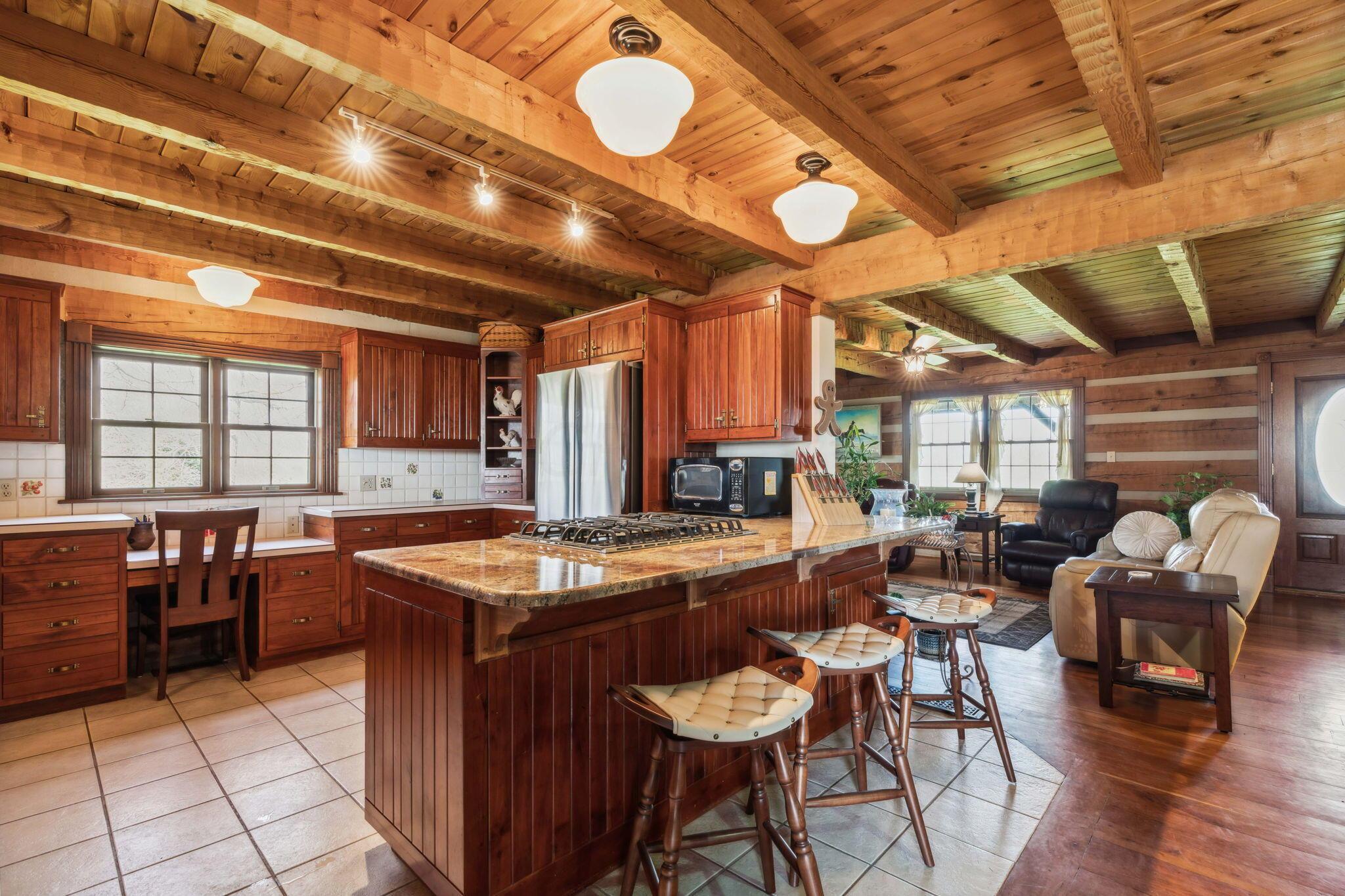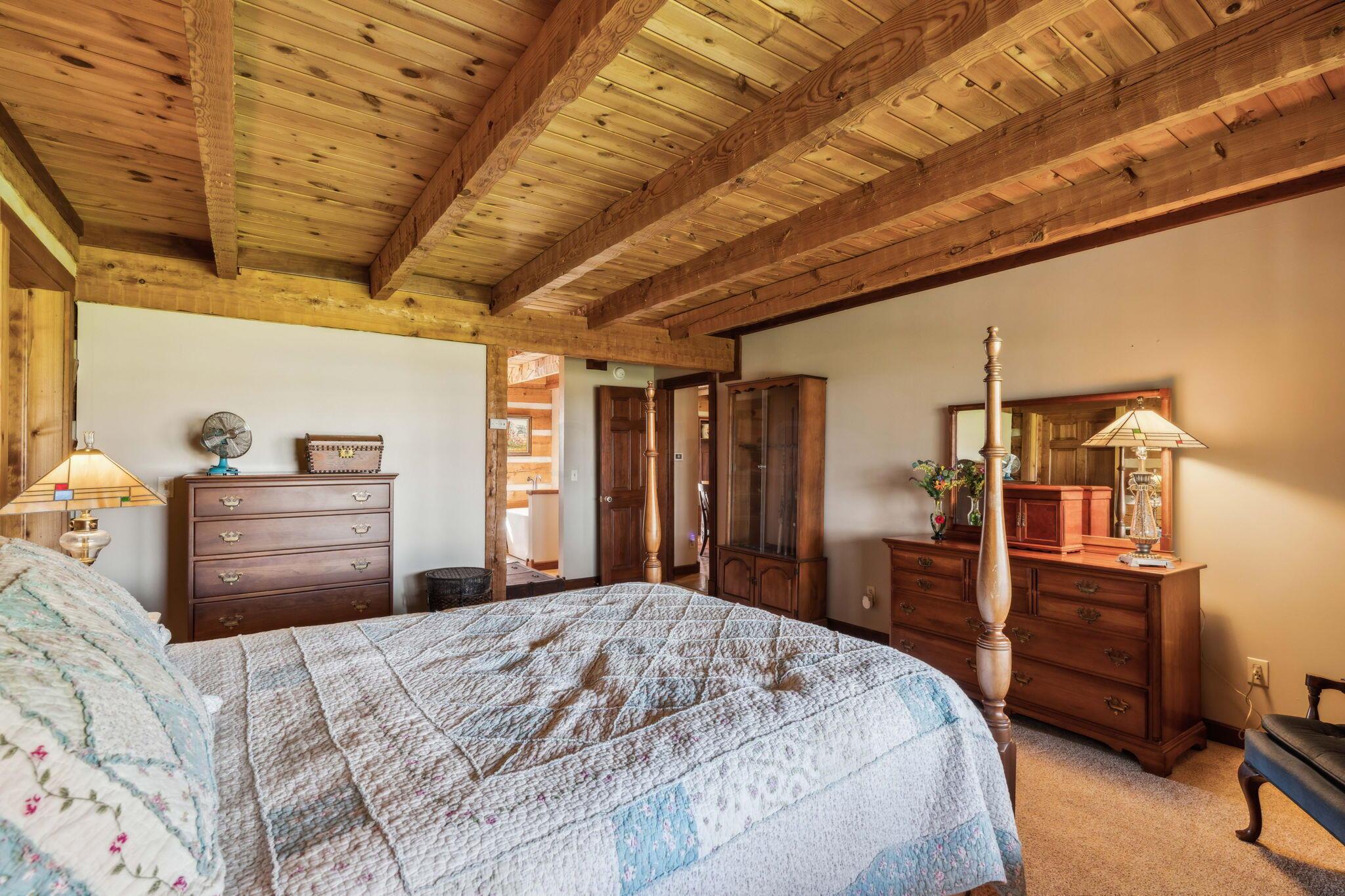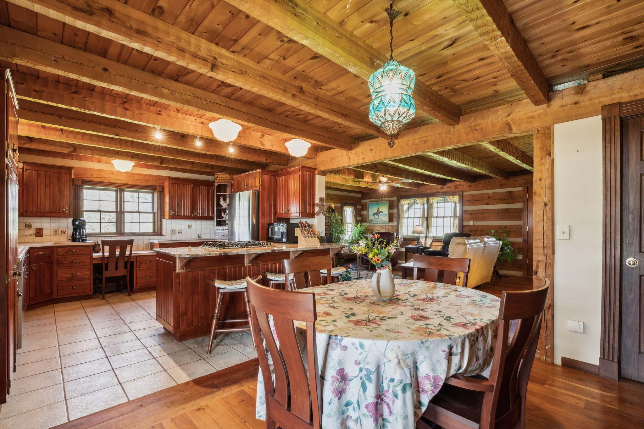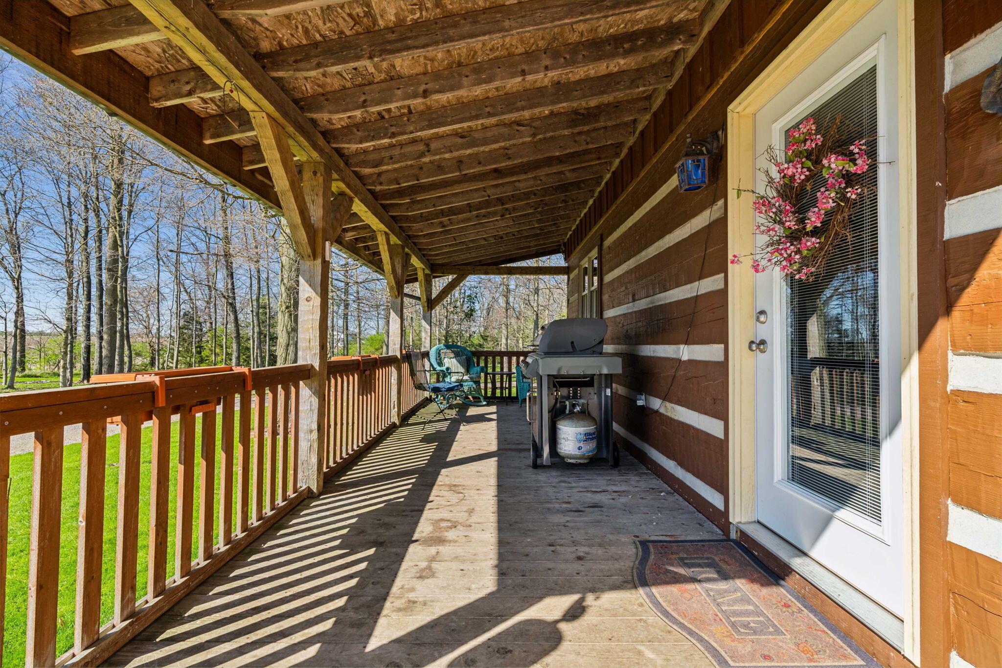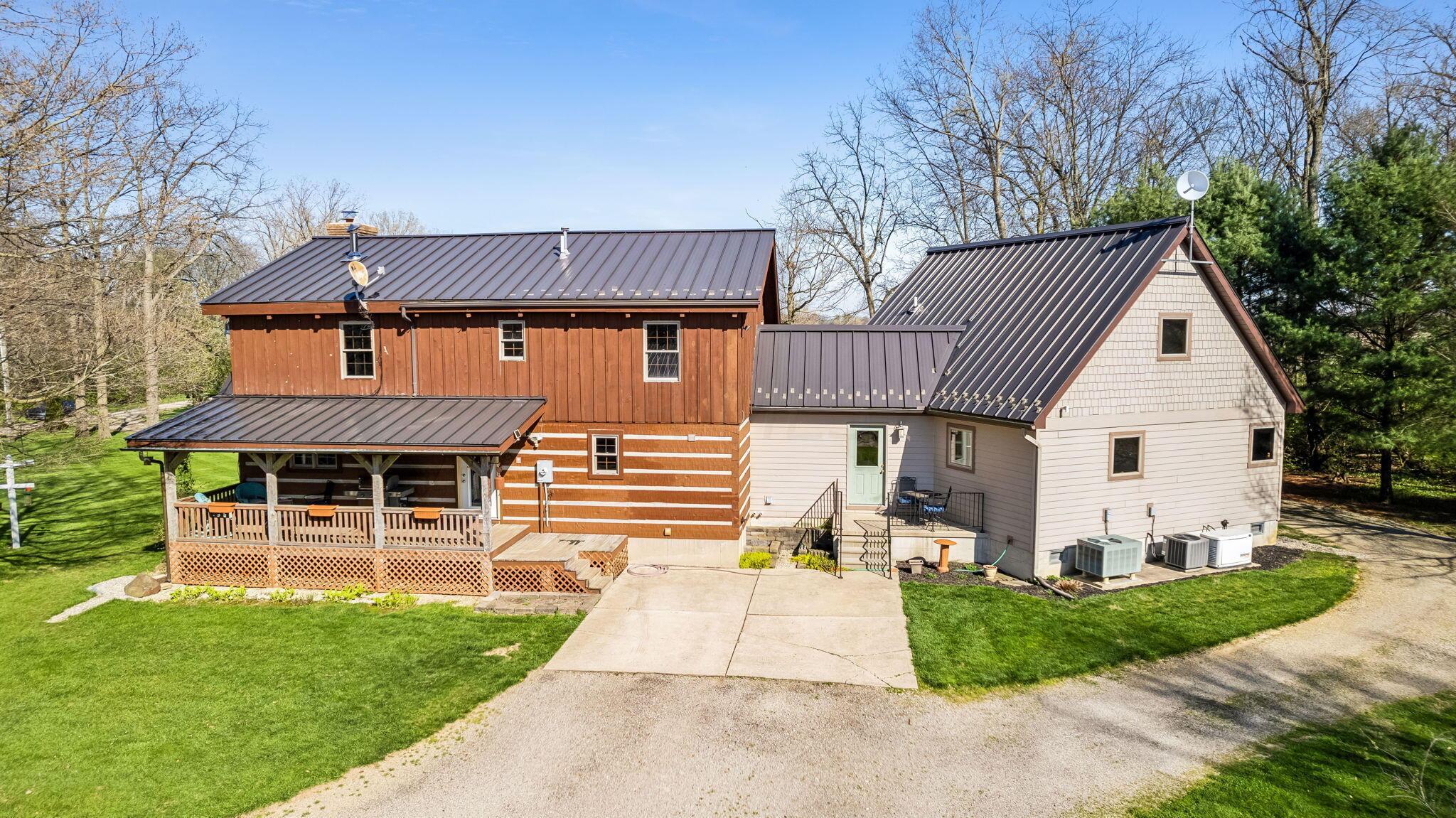 Experience rustic elegance on over 13 acres with this unique log cabin, a true nature lover's dream. The cabin features a 1st floor primary bedroom with en-suite bath and walk-in closet, ensuring comfort. A cozy living area with a wood-burning fireplace sets the tone for relaxing evenings. For guests or family, the property offers a separate guest suite with 2 baths and a full kitchen. Full basement provides ample storage or potential for added living space. Outdoor enthusiasts will love the land and 2 outbuildings; one heated with electric and a kitchen, perfect for entertaining or a workshop, the other for storage or a garage. Water is sourced from a reliable artesian well. Located just a short drive from town, yet offering unparalleled privacy, this property is a one-of-a-kind retreat